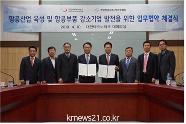 ▲ (사진=대전광역시청 제공)(재)대전테크노파크는 10일 오전 10시 30분 본부동 1층 대회의실에서 한국항공우주산업진흥협회(회장 김조원)와 ‘항공산업 육성 및 항공부품 강소기업 발전을 위한 업무협약’을 체결했다.