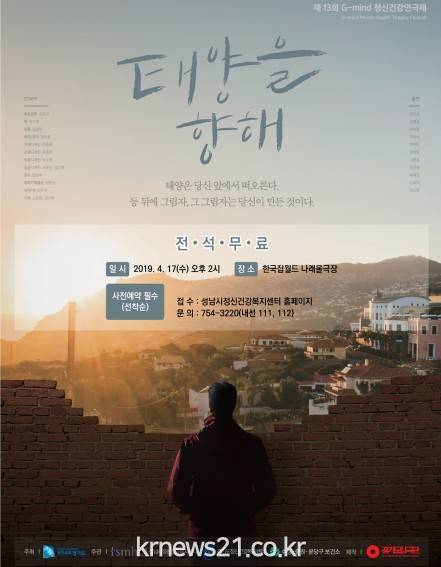 성남시 정신 건강복지센터는 오는 4월 17일 오후 2시 분당구 정자동 한국잡월드 나래울 극장에서 제13회 G-mind 정신 건강연극제인 ‘태양을 향해’ 공연을 한다.