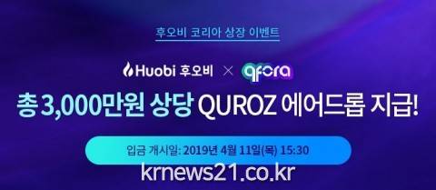 글로벌 디지털 자산 거래소 후오비 코리아(Huobi Korea)가 뷰티 패션 큐레이션 플랫폼 큐포라(QUROZ)를 상장하고 총 3000만원 상당의 에어드롭 이벤트를 진행한다고 12일 밝혔다.