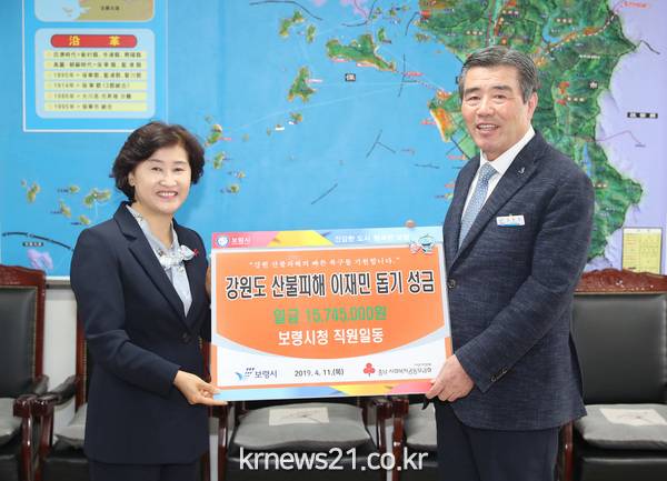 ▲ 강원도 산불피해 돕기 성금 전달 장면보령시는 지난 11일 오후 시장실에서 김동일 시장과 박은희 충청남도사회복지공동모금회 사무처장 등 관계자가 참석한 가운데 강원도 산불피해 지역 주민을 위한 성금 전달식을 가졌다.