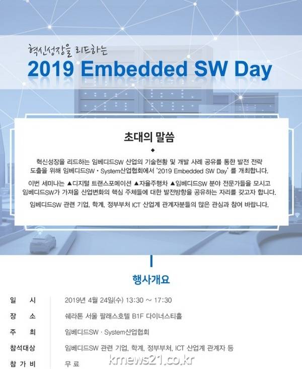▲ (사진= 2019 Embedded SW Day 개최)임베디드소프트웨어·시스템산업협회(회장 장명섭)가 24일(수) 서울 쉐라톤 팔래스 호텔에서 ‘혁신성장을 리드하는 2019 Embedded SW Day’를 주제로 하여 협회 총회를 겸한 임베디드SW 기술세미나를 개최한다고 17일 밝혔다.