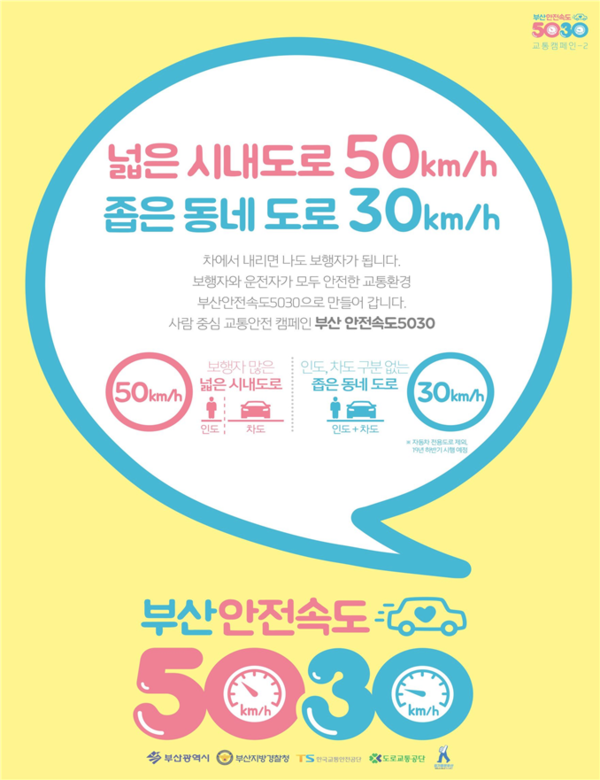 ▲ (사진=홍보 포스터)부산시(오거돈 시장)와 부산지방경찰청은 보행자 교통사고를 예방하기 위해올 하반기 부산 전역에 시행 예정인 「안전속도 5030」사업의 법적 기준이 마련됐다고 밝혔다.