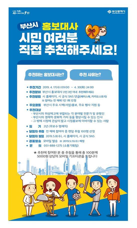 시민 다수의 선택을 받은 인사 중에서 본인의 동의를 거쳐 위촉되는 ‘부산시 홍보대사’는 무보수 명예직으로 시민을 위한 공익 활동이나 부산시 주요시책의 홍보, 재능기부 활동을 하게 된다.