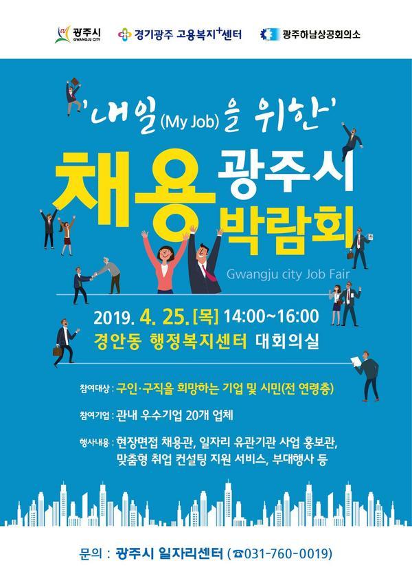 ▲ [사진=내일박람회 포스터]광주시(시장 신동헌)는 오는 25일 경안동 행정복지센터에서 경기광주 고용복지+센터, 광주하남상공회의소와 공동으로 ‘내 일(My Job)을 위한’ 광주시 채용박람회를 개최한다고 18일 밝혔다.