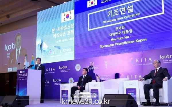 문 대통령은 비즈니스 포럼에서 ‘한․카자흐스탄 경제력의 새로운 바람’을 주제로 기조연설을 진행 했다.