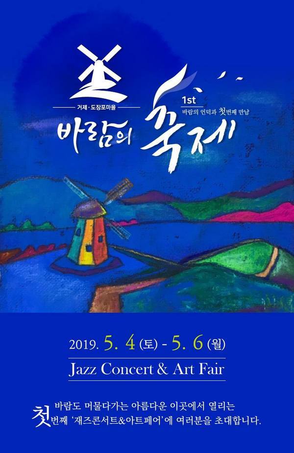 ▲ [사진=아트페어 홍보 포스터]남해의 유명 관광지 거제도 도장포마을 바람의 언덕에서 "제1회 바람의 축제 Jazz Concert & Art Fair"가 오는 2019년 5월 4일(토) ~ 5월 6일(월)까지 열린다. 바람의 언덕은 70가구가 모여 사는 작은 마을 이지만 연간 100만 명 이상 방문하는 관광지로 마을 특성을 살린 축제를 기획하여 주말 여행객들에게 볼거리, 체험거리를 제공하고자 주민 전체가 협의하여 재즈와 미술이 접목된 축제를 열게 되었다. 자발적인 주민들의 후원금으로 축제를 실시하여 주민 모두 주최자의 심정으로 책임감을 가지고 준비하고 있다.