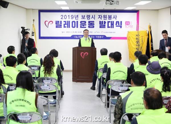 ▲ 자원봉사 릴레이 운동 발대식 장면보령시는 25일 오후 보령시자원봉사센터 회의실에서 김동일 시장과 이상영 자원봉사센터 이사장, 자원봉사 기관・단체 회원 등 50여 명이 참석한 가운데 2019년 보령시 자원봉사 릴레이활동 발대식을 가졌다.