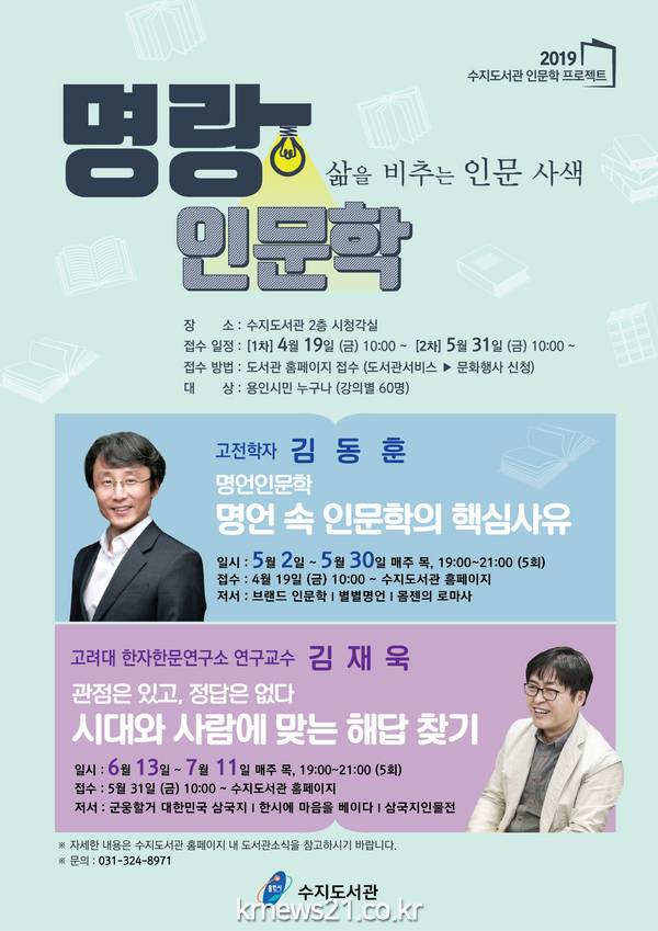용인시 수지도서관은 시민들의 인문 소양을 높이기 위한 인문학 강연을 5월 2일부터 7월 11일까지 시청각실에서 진행한다고 25일 밝혔다.