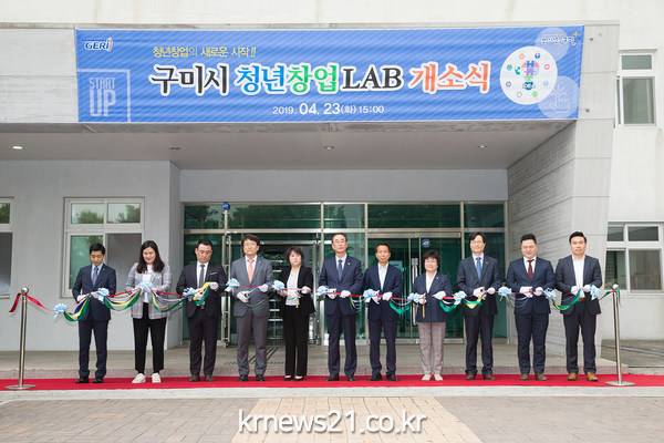 ▲ [사진=구미시 청년창업LAB 개소식]구미시(시장 장세용)와 구미전자정보기술원(원장 박효덕)은 4월 23일(화) 오후 3시에 구미전자정보기술원 혁신관에서 도·시의원, 청년창업자 등 100여명이 참석한 가운데 ’구미시 청년창업LAB‘ 개소식을 가지고, 본격적인 운영에 들어간다.