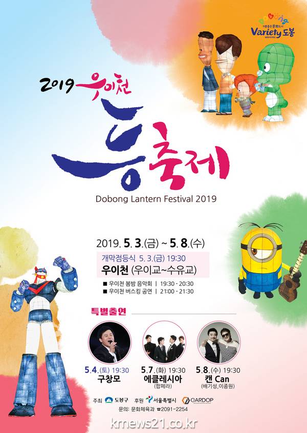 ▲ [사진=우이천 등축제 홍보포스터]도봉구(구청장 이동진)는 오는 5월 3일부터 5월 8일까지 6일간 우이천의 밤을 화려한 빛으로 수놓을 ‘2019 우이천 등(燈) 축제’를 개최한다.