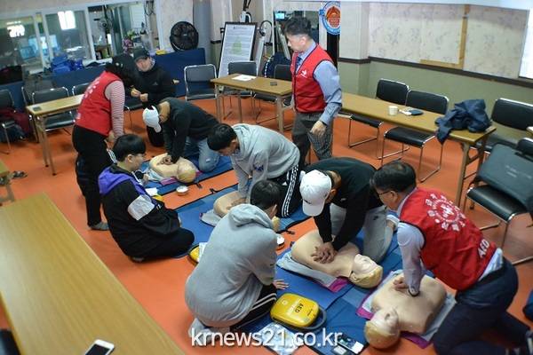찾아가는 교육인 500세대이상 아파트 관리사무소 자동심장충격기 관리자들 대상의 응급처치(심폐소생술) 및 자동심장충격기 사용법 교육은 골든타임 4분 안에 응급처치(심폐소생술)과 자동심장충격기를 사용하여 일반시민들로 하여금 생명 살리는 일에 동참하게 하고자 강사들을 파견해서 하는 교육이라 실기가 매우 중요하다.