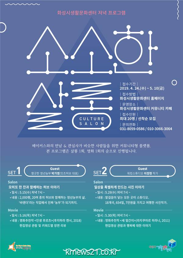 2세트, 총 4일간의 프로그램으로 이루어진 「소소한 살롱」은 5월15(수), 16(목)에는 청년 농부 박가영과 특별히 제조한 모히또를 마시며 허브 이야기를, 29(수), 30(목)에는 특별한 경험의 이정현 워킹 스튜디오 사진작가와 함께 행복을 주제로 이야기를 나눈다. 살롱과 영화에 대한 이야기가 양일간 진행되며, 신청은 화성시 생활문화센터 홈페이지에서 가능하다.