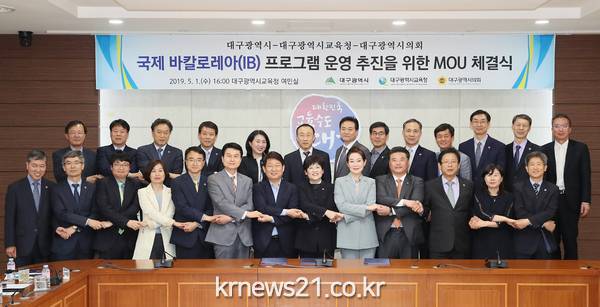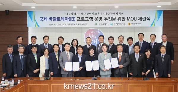 대구시교육청(교육감 강은희)은 오늘(1일) 오후 4시 시교육청 여민실에서 대구시(시장 권영진), 대구시의회(의장 배지숙)와 ‘국제 바칼로레아(IB) 프로그램 운영 추진을 위한 협약식’을 개최하였다.