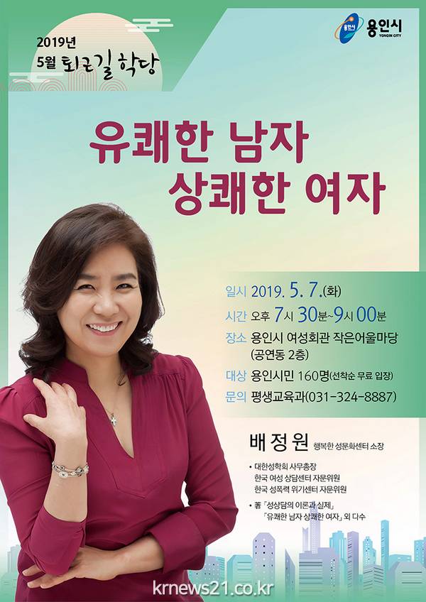 이번 강연은 배정원 행복한 성문화센터 소장이 ‘유쾌한 남자 상쾌한 여자’를 주제로 남자와 여자의 사고방식 차이를 이해하고 서로 배려하면서 행복하게 살아가는 방법을 소개할 예정이다.