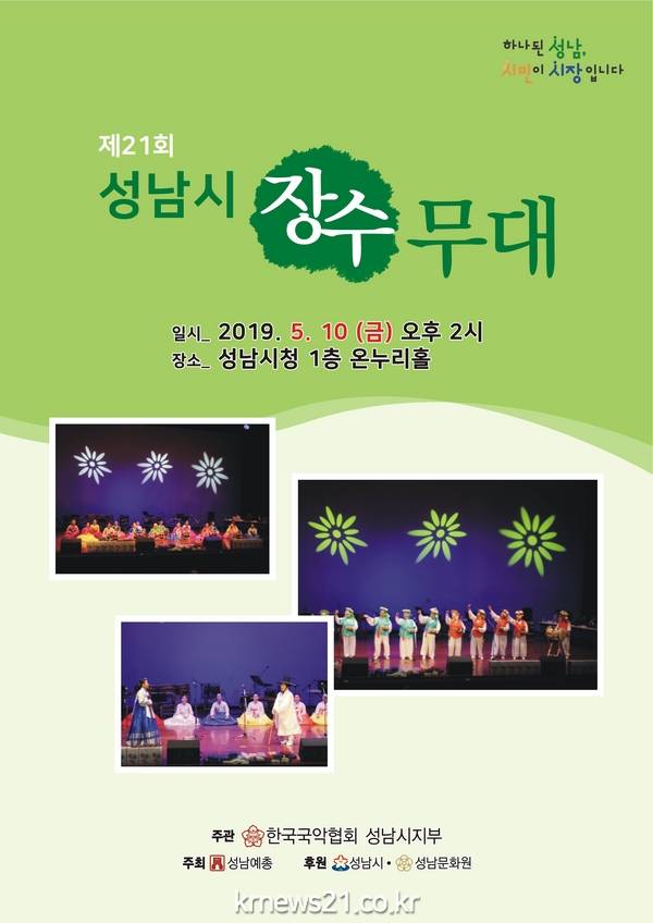 성남시 관내 어르신들의 건전한 여가생활과 취미 생활을 장려하고자 개최하는 제21회 성남시 장수무대가, 한국국악협회 성남시지부(지부장 이향우)주관, 성남예총 주최, 성남시 후원으로 5.10(금) 오후 2시, 성남시청 1층 온누리 홀에서 열린다.