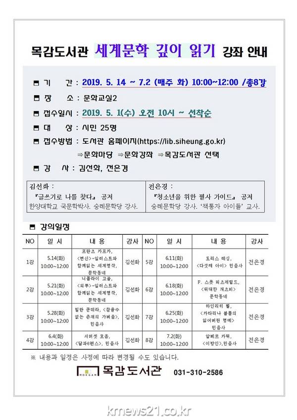 시흥시 목감도서관은 오는 5월 14일부터 7월 2일까지 총 8회에 걸쳐「세계문학 깊이 읽기」문학 강좌를 운영한다.