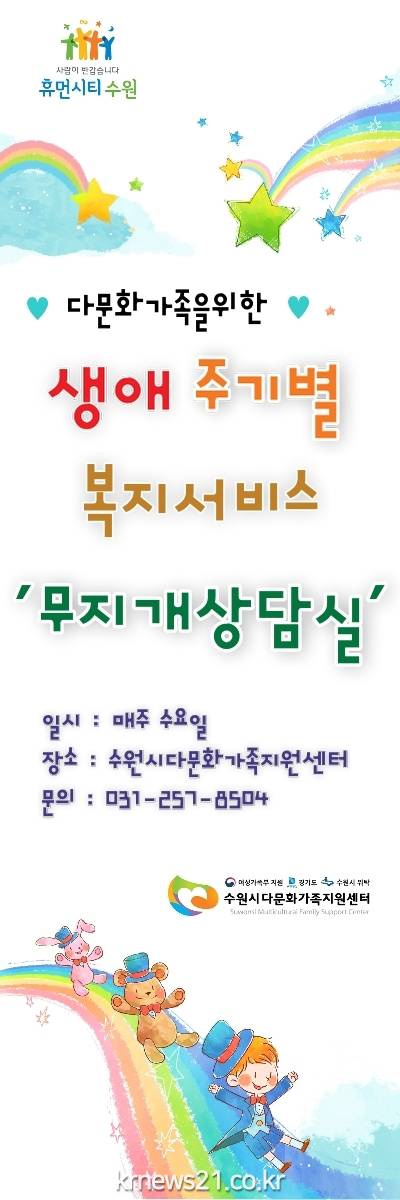 수원시 관계자는 “무지개 상담실을 다문화가족의 소통 공간으로 만들어 그들의 정착을 돕겠다”며, “많은 다문화가족이 이용하길 바란다”고 말했다.