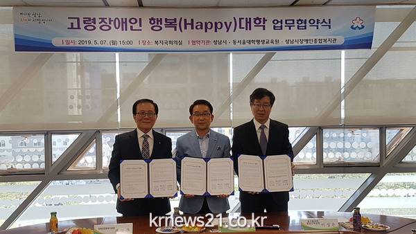 협약에 따라 동서울대학교 오는 5월 13일 수정구 복정동 동서울대 평생교육원에 50세 이상 고령 장애인 20명이 수강할 수 있는 ‘행복(Happy) 대학’을 개설한다.