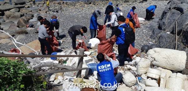이날 참가자들은 해안가에 방치된 폐 어구 및 폐스티로폼 등 해양쓰레기 3톤을 수거하여 쾌적한 연안 환경 조성을 위해 구슬땀을 흘렸다.