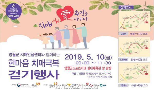 ▲ [사진=걷기행사 홍보문]영월군보건소 치매안심센터는 오는 5월 10일 오전 9시부터 스포츠파크 실내체육관 앞 광장을 출발하여 그 일대 3Km 구간을 걷는 “한마음 치매극복 걷기행사”를 개최한다.