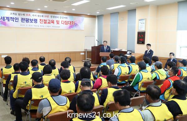 ▲ 친절 교육 및 자정결의 장면보령시는 지난 8일 오후 대천5동사무소 회의실에서 대천관광협회와 신흑청년회 회원 등 100여 명이 참석한 가운데 미소와 친절이 가득한 관광객 환대 문화 조성을 위한 친절 교육을 실시했다.