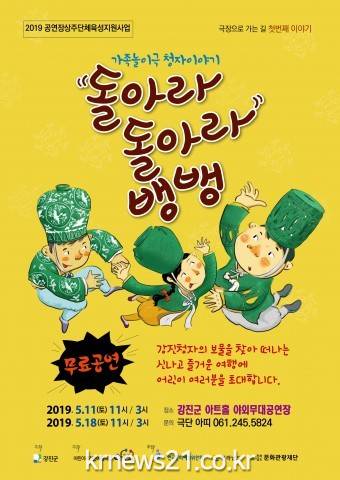 ▲ [사진=돌아라 돌아라 뱅뱅 공연 포스터]5월 가족의 달 어린이와 가족을 위한 무료공연과 체험이 강진군아트홀 야외무대에서 펼쳐진다.