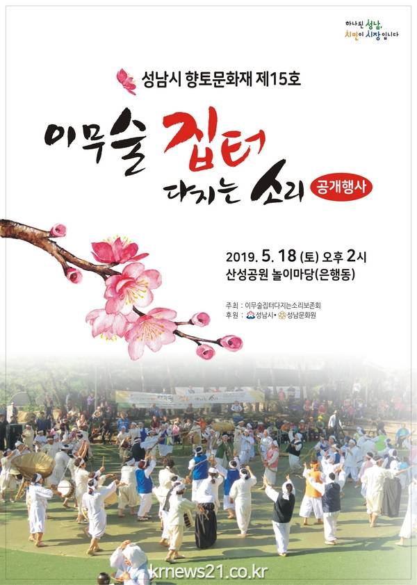 성남지역의 대표 향토민속놀이인 성남시 향토 문화재 제15호 '이무술 집터 다지는 소리' 2019 공개행사가, 5.19(토) 오후 2시 산성 공원 놀이마당(은행동)에서 열린다.