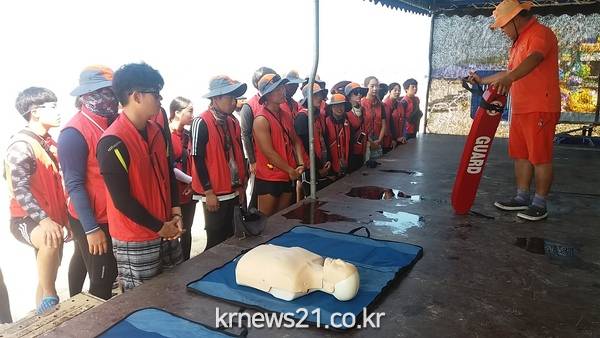 ▲ 지난해 물놀이 안전요원 교육 장면보령시는 여름철 대천해수욕장 개장 기간 중 물놀이 인명사고에 적극적으로 대처하고 사전 예방적 안전관리 강화를 위해 여름철 물놀이 유급안전관리요원을 모집한다.