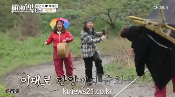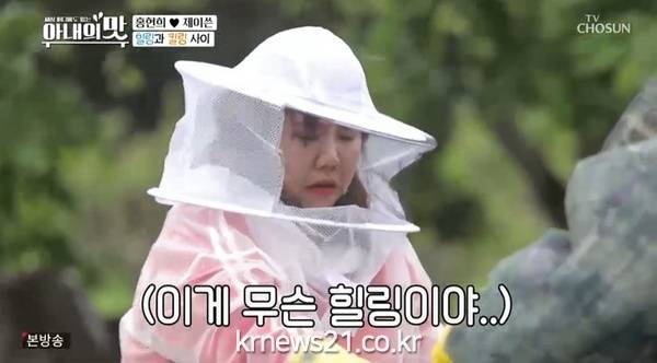 ▲ [사진제공 = TV CHOSUN ‘아내의 맛’ 캡처]홍현희-제이쓴 부부는 진짜 꿀이 떨어지는 벌과의 전쟁을 벌였다. 꿀벌이 가득한 양봉장으로 향한 두 사람은 수 만 마리 벌들에 기겁했지만, 홍현희는 직접 왕대벌집을 제거하며 기절초풍 힐링타임을 가졌다. 또한 홍현희-제이쓴 부부와 자연인은 의외의 케미를 터트리며 빅재미를 선사했다. 자연인은 양봉 초보인 희쓴 부부보다 더욱 벌에 당황, 다급하게 바지를 벗고, 벌침에 8방이나 쏘이는가 하면, 엿장수 가위를 들고 추는 각설이 타령 개인기를 홍현희에게 전수, 지리산 산 속을 뜬금없는 각설이 체험장으로 만들었다. 홍현희-제이쓴 부부는 자연인을 따라 샘물에 세수하고, 취나물 양치를 한 뒤 두릅김밥, 북엇국으로 두 번째 자연밥상을 맞았다. ‘시장이 반찬’이라고 하루 종일 고생하고, 치킨, 피자, 햄을 그리워하던 모습과 달리 유기농 자연밥상을 깨끗이 비우며 달라진 모습을 보여줬다.