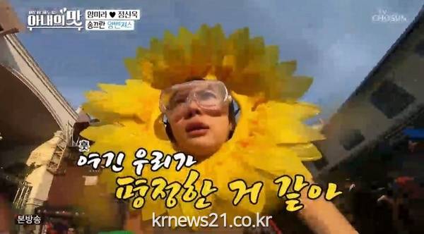 ▲ [사진제공 = TV CHOSUN ‘아내의 맛’ 캡처]양미라-정신욱 부부는 태국의 최대명절인 송끄란 축제에 이호-양은지 가족과 함께 출동했다. 앞서 한국서 이고지고 싸온 해바라기 가면을 얼굴에 착용한 양미라-정신욱 부부는 오히려 가는 곳마다 시선을 끌어, 카오산 로드의 ‘과녁’이 된 채 ‘물의 전쟁’을 치렀다. 해외 언론들의 카메라 세례는 물론 지나가는 관광객들의 물총 저격 1순위가 돼 그야말로 물에 젖은 생쥐 꼴이 될 정도로 흠뻑 젖었고, 특히 양미라는 걸음을 뗄 때마다 정신을 차리지 못했을 정도로 집중 공격을 받았다. 이어 해가 진 후 야시장 나들이를 떠난 양미라-정신욱 부부는 특유의 ‘먹방 레이더’를 작동, 유명 길거리 맛집을 찾아냈고, ‘위(胃)대(大)한’ 부부는 꿍탕이라는 매콤한 해물찜을 씹고 뜯고 맛보며 태국에서의 식욕을 풀가동했다. 더욱이 양미라는 세 아이를 키우며 알콩달콩 사는 동생 부부의 행복에 눈시울을 붉혀 자매간의 돈독한 정을 드러냈다.