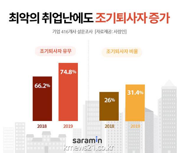 전체 입사자 대비 조기퇴사자의 비율은 3분의 1에 해당하는 평균 31.4%로 집계됐다. 이 역시 작년 평균 조기퇴사자 비율(26%)에 비해 5.4%p 늘어나 심각성을 더했다.