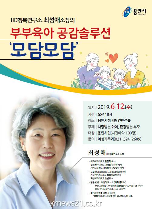 용인시는 오는 6월 12일 시청 컨벤션홀서 자녀 양육에 어려움을 겪고 있는 시민 100명을 대상으로 육아에 대한 무료 특강을 진행한다.