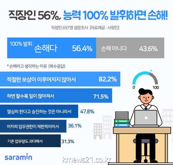 구인구직 매칭플랫폼 사람인(www.saramin.co.kr 대표 김용환)이 직장인 697명을 대상으로 ‘직장에서 능력 발휘’를 주제로 조사한 결과, 56.4%가 ‘능력을 다 발휘하는 것은 손해’라고 답했다.