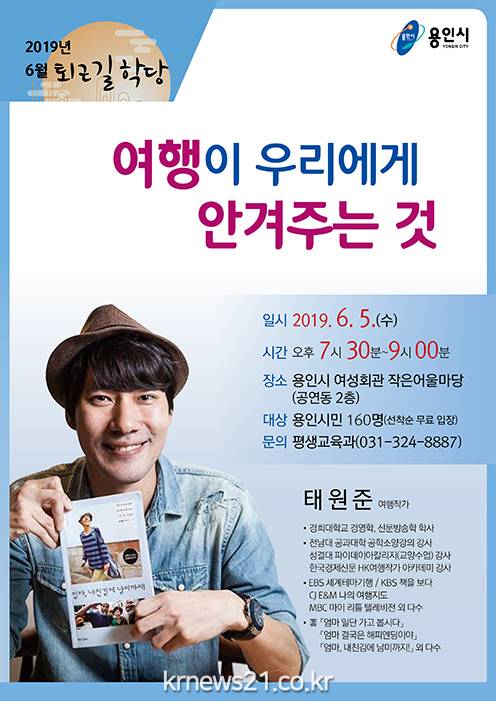 용인시는 직장인을 위한 저녁 인문강좌로 6월 5일 여성회관 작은 어울마당에서 태원준 여행작가가 세계여행 경험담을 나누는 무료 특강을 연다.