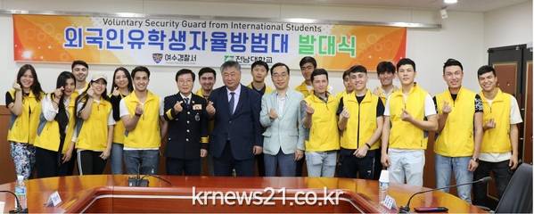 여수경찰서(서장 김근)는 2019. 6. 3(화) 전남대학교 여수캠퍼스에서 본교 재학 중인 외국인 유학생 22명(우즈베키스탄 18, 파키스탄 4) 참여한 자율방범대 발대식을 개최하였다.