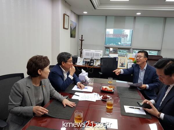 ▲ [사진제공=홍철호의원실]김포시 홍철호·김두관 국회의원이 7일 오전 신동근 의원과 함께 김현미 국토부장관을 만나 서울지하철 5호선 김포연장선(가칭 한강선)의 조속한 착공을 위한 방안을 논의했다.