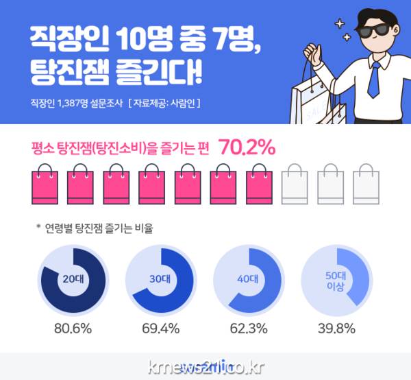 ▲ [사진=“직장인 70%, 탕진잼 즐긴다!” ]지친 일상에 작은 기분전환을 주기 위해 소소한 낭비를 하는 ‘탕진소비’를 즐기는 직장인이 늘고 있다. 실제 직장인 10명 중 7명(70.2%)은 ‘탕진잼’을 즐기고 있는 것으로 나타났다.