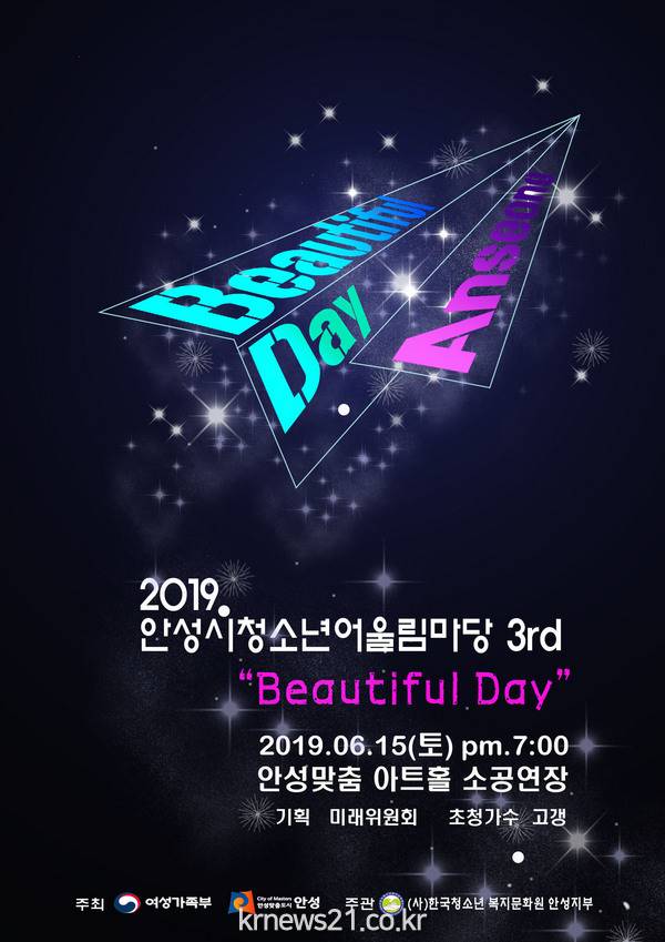 안성시는 한국청소년복지문화원 안성지부(지부장 김영식) 주관으로 여름을 만나는 세상에서 가장 아름다운 주말, 청소년들의 행진 ‘Beautiful Day'를 오는 15일 오후 7시 안성맞춤 아트홀 소공연장에서 개최한다고 밝혔다.