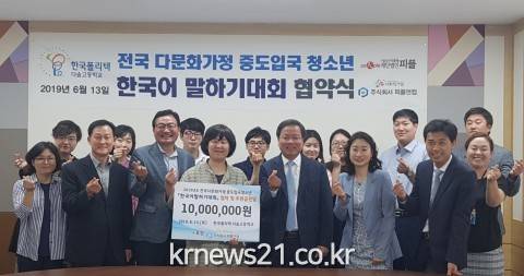 ▲ [사진=피플앤컴은 다문화 청소년을 위해 1000만원 후원]재단법인피플은 피플앤컴, 다솜고등학교와 함께 13일 오전 11시 충북 제천에 위치한 다솜고에서 ‘전국 다문화가정 중도입국 청소년 한국어 말하기 대회’ 협약식을 개최했다고 밝혔다.