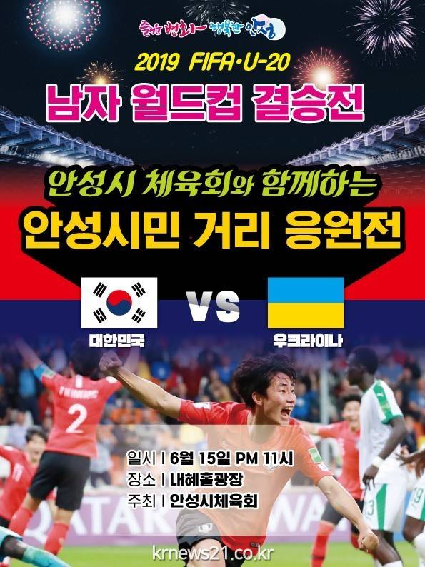 안성시체육회(회장 우석제)는 6월 16일 오전 1시에 열리는 ‘2019 FIFA U-20 월드컵 결승전’에서 우크라이나를 상대로 대한민국의 승리를 기원하는 거리 응원전을 15일 밤 11시부터 안성시 내혜홀 광장에서 펼친다고 밝혔다.