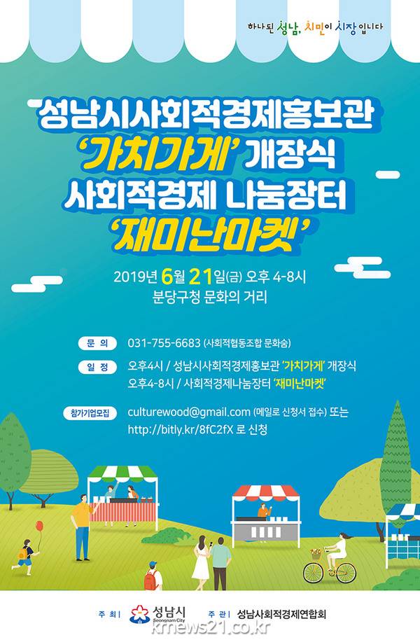 오후 8시까지 성남시와 인접한 시흥, 이천, 광주, 안양시의 사회적 경제 기업 30개 팀이 모여 ‘재미난 마켓’을 운영하며, 성남시립국악단의 축하 공연 등 사회적 경제 놀이마당이 개최된다.