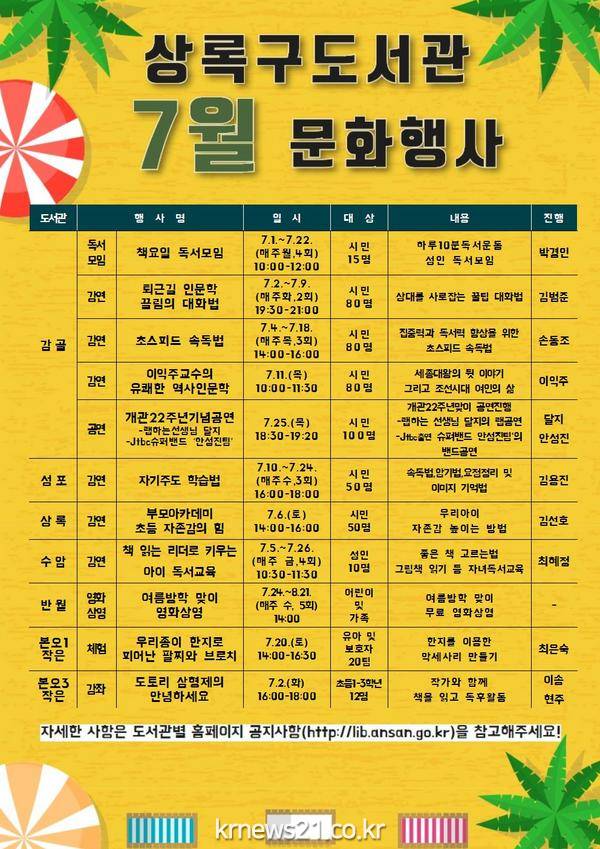 이밖에도 수암도서관 ‘책 읽는 리더로 키우는 아이 독서교육’(7.5.~7.26. 매주 금), 반월도서관 ‘여름방학 맞이 영화상영’(7.24.~8.21. 매주 수), 본오1동 작은도서관 ‘우리 종이 한지로 피어난 필찌와 브로치’ 체험 (7.20. 토), 본오3동 작은도서관 작가와 함께하는 독후 활동 프로그램 ‘도토리 삼 형제의 안녕하세요’(7.2. 화)을 운영한다.