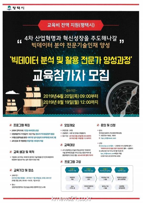 평택시(시장 정장선)는 4차 산업혁명 핵심기술인 빅데이터 분야의 산업 맞춤형 핵심 인재 양성을 위해 ‘빅데이터 분석 및 활용전문가 양성과정’프로그램에 참여할 청년교육생을 6월 20일부터 8월 19일까지 2개월간 모집한다.