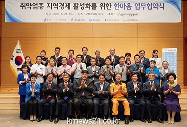 용인시는 21일 문화예술원 국제회의실에서 대리운전, 퀵서비스 등의 취약업종 종사자의 고용안정과 지역경제 활성화를 위해 용인시의회, 용인소방서, 용인시상공회의소, 취약업종협의회와 업무협약을 맺었다.