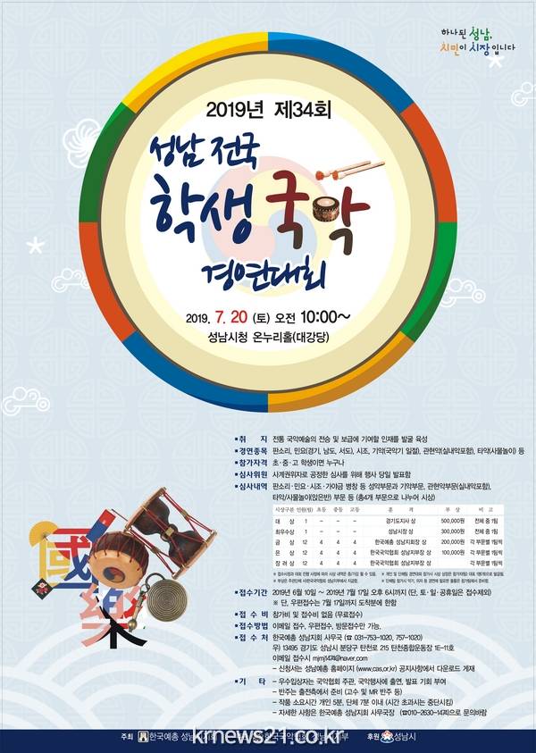 (사)한국국악협회 성남시지부(지부장 이향우)가 주관하는 ‘제34회 성남 전국학생 국악 경연대회’가, 7.20(토) 오전 10시부터 성남시청 1층 온누리 대강당에서 성남 예총 주최, 성남시 후원으로 개최된다.