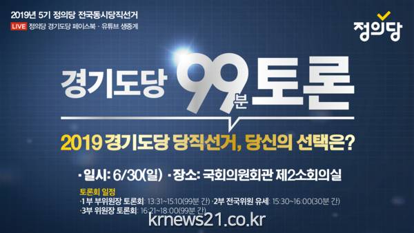 정의당 경기도당 선거관리위원회(위원장 최화영)는 2019 정의당 5기 전국동시당직선거를 맞아 오는 6월 30일 13시부터 서울 국회의원회관 제2소회의실에서 경기도당 위원장, 부위원장 토론회를 개최한다. 이날 행사에서는 토론회와 더불어 경기도 전국위원 후보들의 합동유세도 동시에 진행된다.