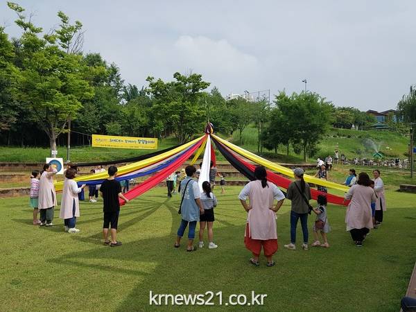 어르신을 대상으로 준비된 전통놀이터는 어르신들이 직접 나무 비석을 꾸며 아이들에게 비석 치기 놀이를 알려주고, 손 실뜨기, 고무줄놀이를 함께하며 세대 통합의 시간을 마련했다. 또한, 흥겨운 꽹과리 소리에 맞춰 펼쳐진 단심줄놀이와 대동 놀이는 연령·성별에 상관없이 참여한 주민 모두 한마음 협동심을 보여줬다.