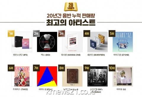 역대 20년간 누적 판매량 2위는 엑소(EXO), 3위는 워너원(WANNA ONE)이 차지하였으며, 세븐틴, 아이즈원, 트와이스, 샤이니, 뉴이스트, 소녀시대, 아이유가 각각 4~10위를 차지한 것으로 나타났다.