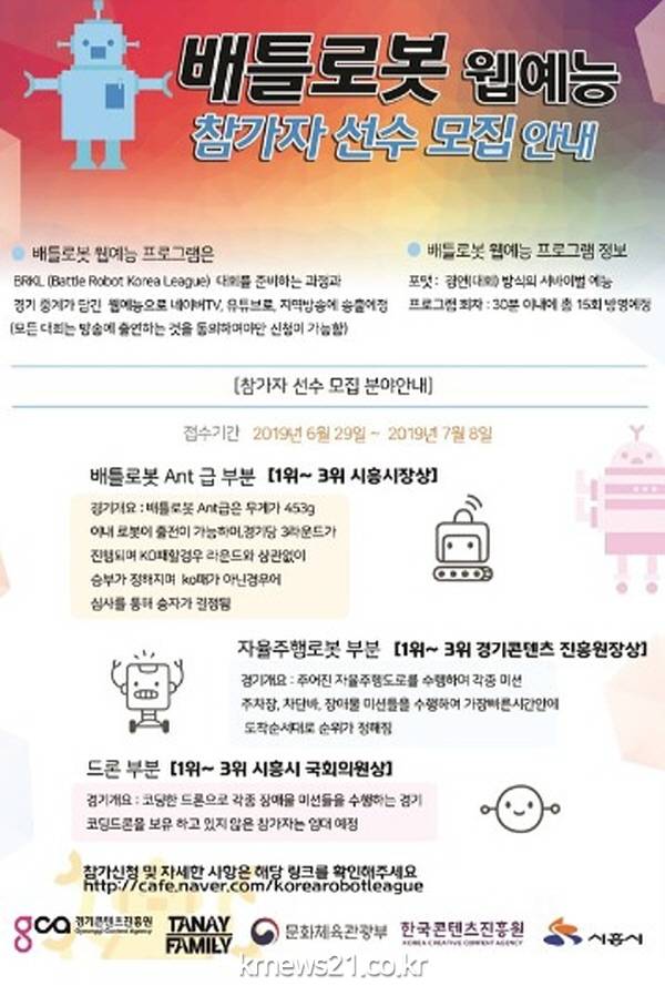 경기콘텐츠진흥원(이사장 김경표)은 오는 7월 8일까지 로봇대회 ‘배틀 로봇 코리아 리그(BRKL : Battle Robot Korea League)’ 3개 부문(로봇, 자율주행 로봇, 드론)에 참여할 선수를 모집한다.