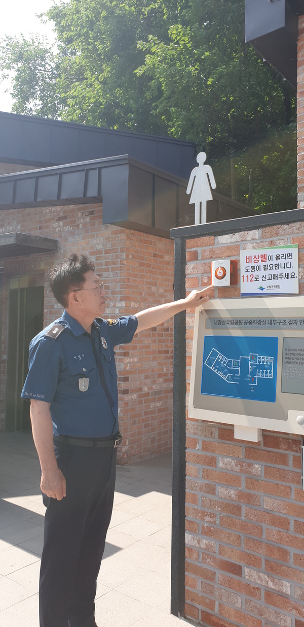 지난 4일 공중 화장실에 설치된 여성안심 벨 작동상태를 점검하면서 화장실 내부 및 주변 전등 밝기 등 범죄예방진단을 실시하였다.